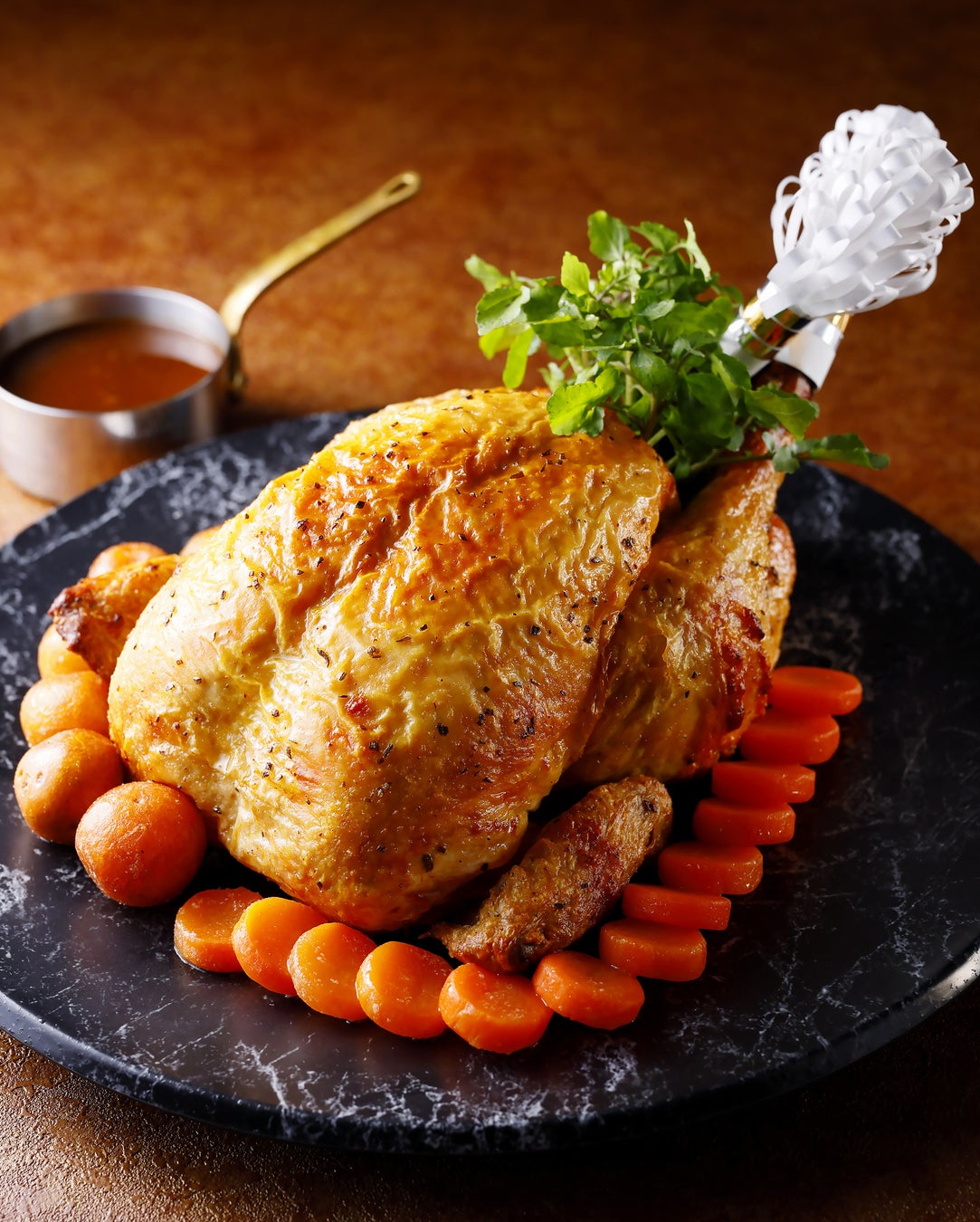 和歌山県産の温州みかんを乾燥させた果皮をブレンドした飼料を与え、山麓の自然の恵みに囲まれ育てられた“紀の国みかんどり”をローズマリーとともに香ばしくローストしました。ホテル特製ソース、フライドポテト、人参のグラッセとともにお召しあがりいただけます。