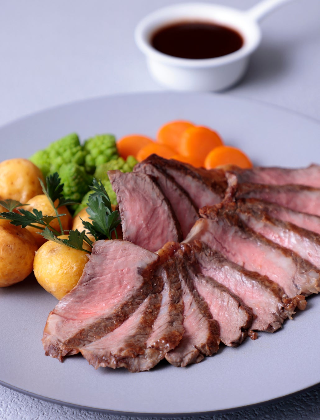 国産牛のロースを低温調理で柔らかく焼き上げました。ホテル自家製の赤ワインソースとフライドポテト、ロマネスコ、人参のグラッセを添えています。