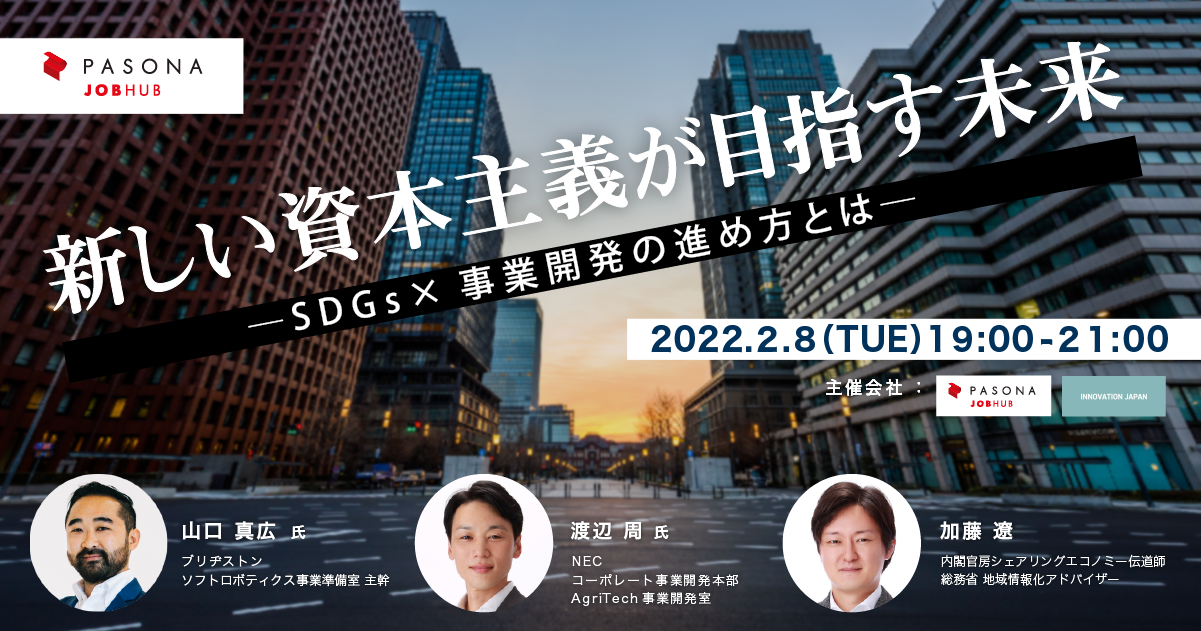 そこでこの度パソナJOB HUBは、オンラインセミナー『新しい資本主義が目指す未来 ~SDGs×事業開発の進め方とは~ 』を2月8日(火)に開催いたします。同ウェビナーでは、ブリヂストンおよびNECで活躍するイントレプレナー/イノベーターが登壇し、両社の取り組み事例やサステナブルな事業開発を通じた企業価値向上のポイントについて対談形式でお話いたします。