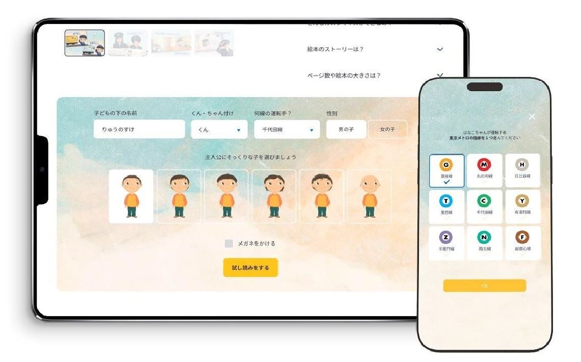 パーソナライズド絵本は、専用サイト上で、絵本に登場する電車、主人公の名前やイラスト、お子さま向けのメッセージ等をカスタマイズして注文できます。電車は、東京メトロの9路線から選べます。路線ごとに固有な車両デザインや制服デザイン等を再現したイラストをぜひお楽しみください。また、専用サイト上では、注文前に、カスタマイズ後の絵本を試し読みでき、路線等の選び直しや修正が可能です。出来上がりを確認した上で、安心してご購入いただけます。