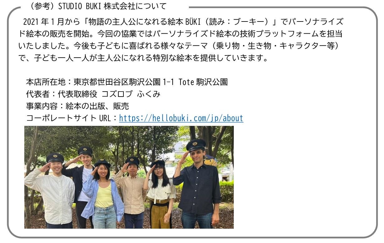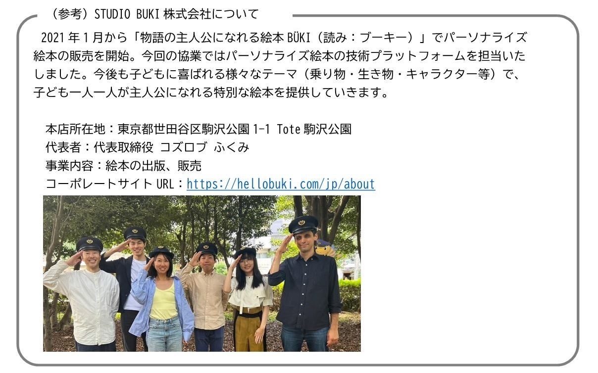今後も東京メトロとSTUDIO BUKIは、「すべての子どもたちが目指す場所へ、大切な夢へ、ワクワクする未来へ、たどり着くことができますように」との想いを込めて、“電車”や“絵本”を通して、未来を担う子どもたちの夢や大好きを応援する施策の推進に取り組んでまいります。
