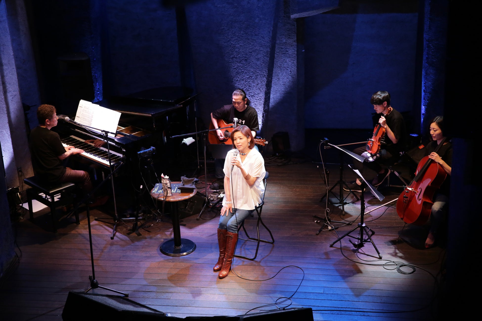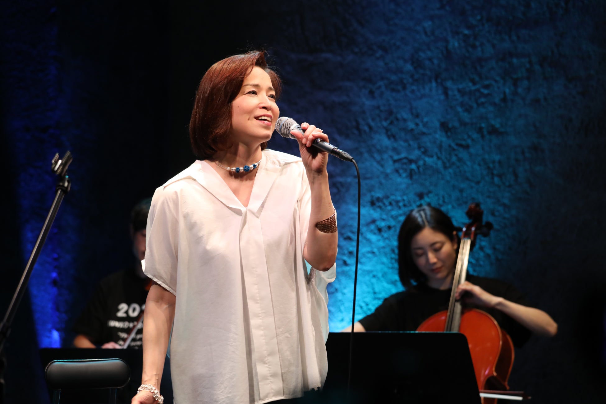 続いて披露したのは中島みゆき‘75年のデビューシングル「アザミ嬢のララバイ」。研ナオコをはじめ多くの歌手がカバーしてきた名曲、先の「初恋」からは一転、哀しみやわびしさが漂う歌詞を気だるく呟くように歌い、冒頭から対照的な2曲を披露した石原。表現者としてこの日のライブへの意気込みを感じさせる選曲に、会場の期待が高まっていく。