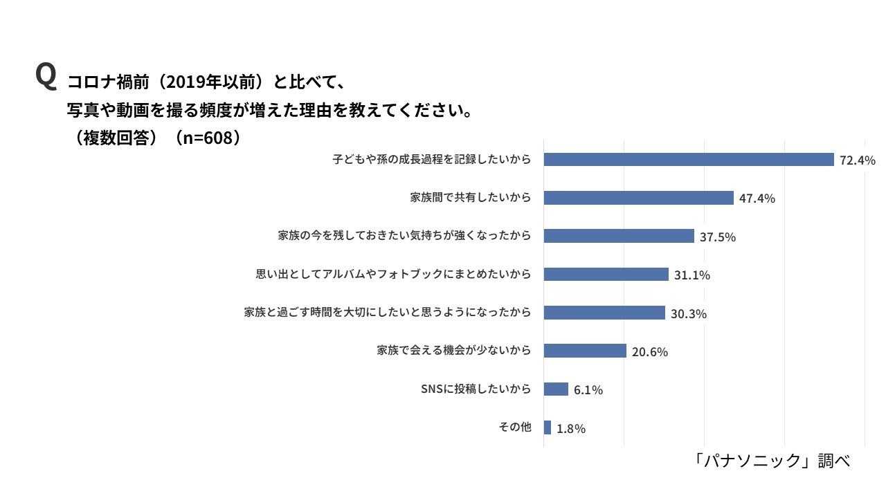 《コロナ禍前と比較して写真や動画を撮る頻度が増えた方も7割以上。増えた理由で最も多かったのは「子どもや孫の成長過程を記録したいから」で72.4%、「家族間で共有したいから」が47.4%、「家族の今を残しておきたい気持ちが強くなったから」が37.5%という結果に》