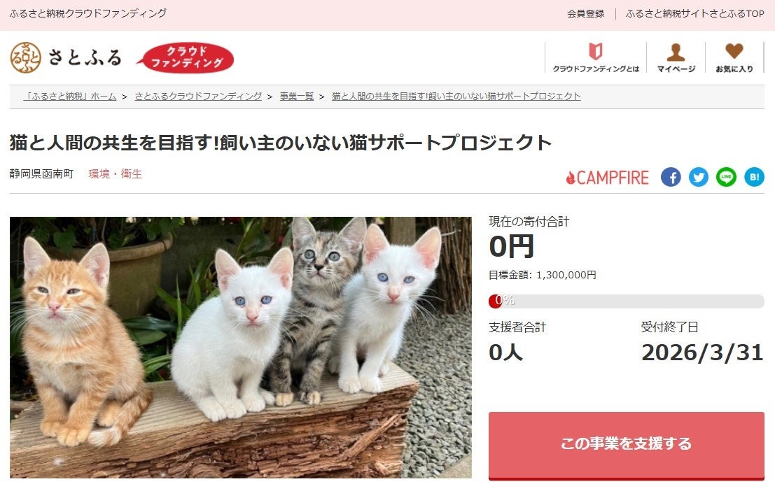 静岡県函南町とふるさと納税ポータルサイト「さとふる」を運営する株式会社さとふる(本社:東京都中央区、代表取締役社長 兼 CEO:藤井 宏明)は、「さとふるクラウドファンディング」にて、「猫と人間の共生を目指す!飼い主のいない猫サポートプロジェクト」の寄付受け付けを2025年10月15日より開始します。