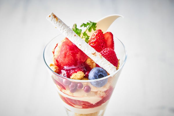 15種類の野菜を使用した前菜はグリルとフレッシュを織り交ぜ、ポテトサラダには和テイストの"いぶりがっこ”を加えたオリジナル。彩り豊かな一皿に仕上げました。メインはスパゲティーニ、ペンネ、プラス料金で魚料理または肉料理の4種類から選べ、またこの時期ならではの苺を使ったパフェが食事の最後に登場します。