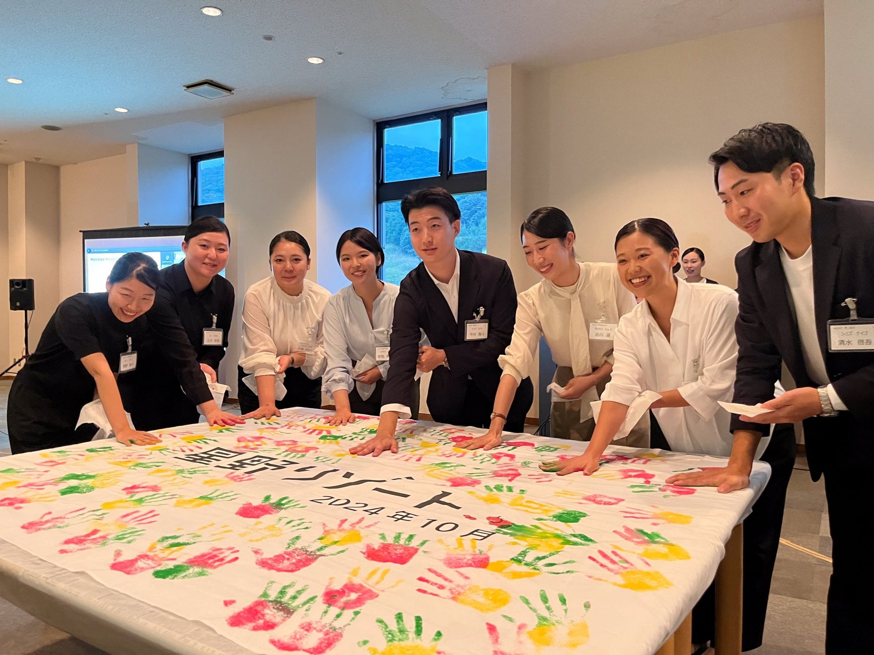 「旅を楽しくする」をテーマに国内外72施設を運営する星野リゾートは、2024年10月5日に入社式を実施しました。この秋には、101名の新入社員を迎え、福島県にある星野リゾート 磐梯山温泉ホテルにて、新入社員研修「Wrm-up Camp」と入社式「契りの会」を行いました。研修期間では、ホテル運営や組織の価値観を学び、最終日に行われた入社式では、これから働く決意を込めて、手のひらに絵の具をひたし、手形を押す「契りの手形」を結びました。この後、全国各地の施設に着任します。
