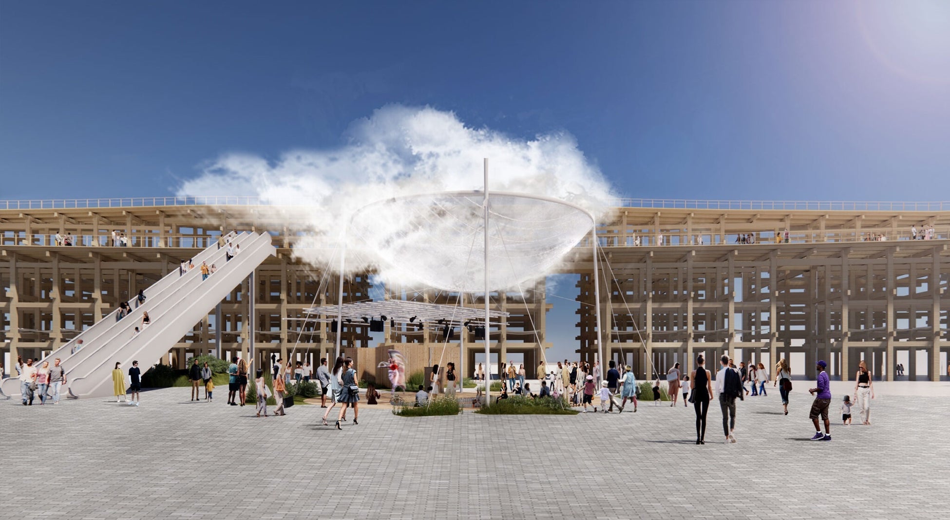 メインゲート正面ポップアップステージ(東内)に「CLTキャビン」「観客席ウッドデッキ用木材」を提供