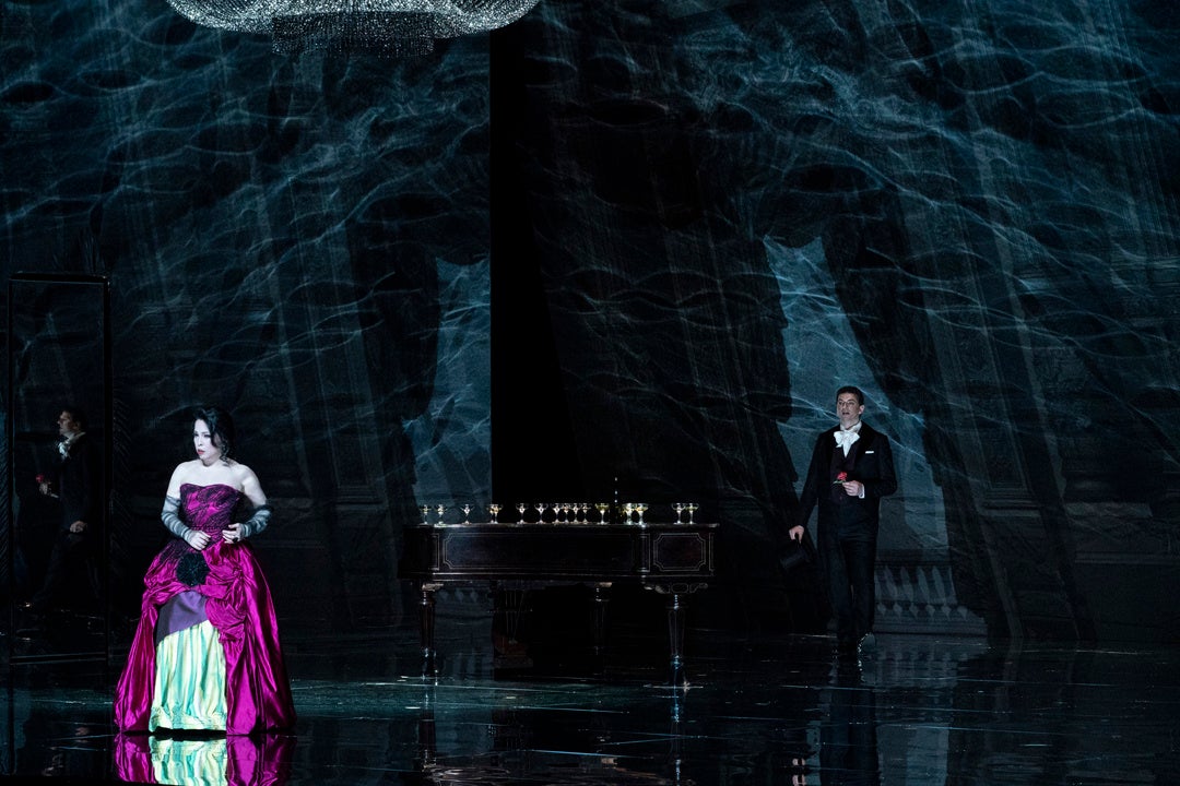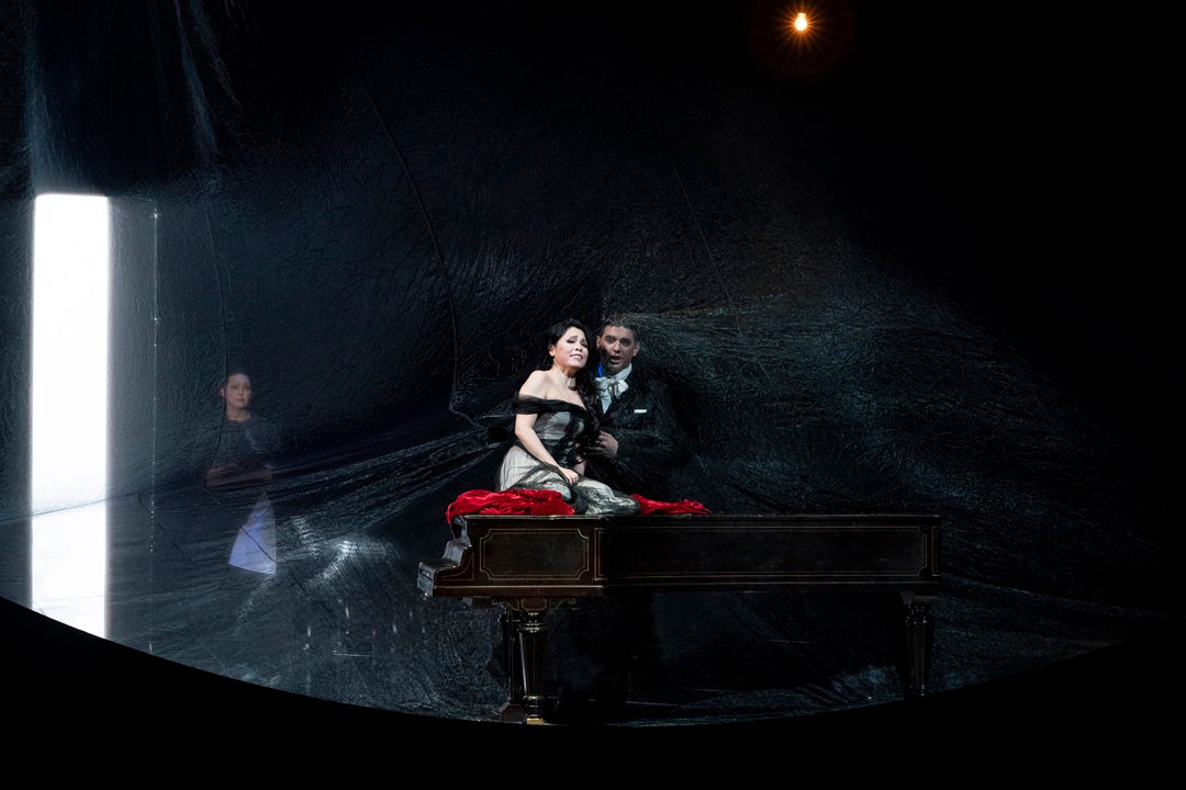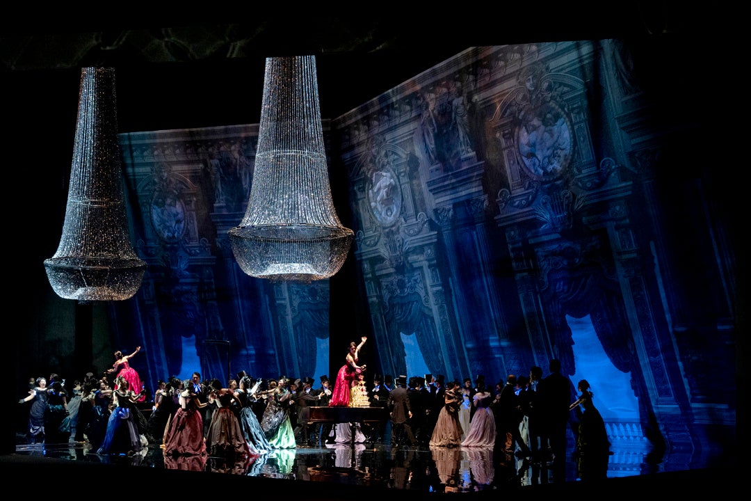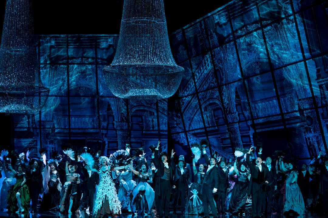 演出のヴァンサン・ブサールは色彩にこだわる洗練されたビジュアルの舞台に定評があり、この『椿姫』でもその美的センスを存分に発揮。高さ12メートルものシャンデリアや巨大な鏡に囲まれた陰影の深い舞台で効果的に心象風景を描出し、男性社会に誇り高く生きた女性ヴィオレッタの姿を印象付けます。ヴィオレッタの心理があぶり出される求心的な演出は、現代に生きる私たちの共感を呼び、圧倒的感動をもたらします。