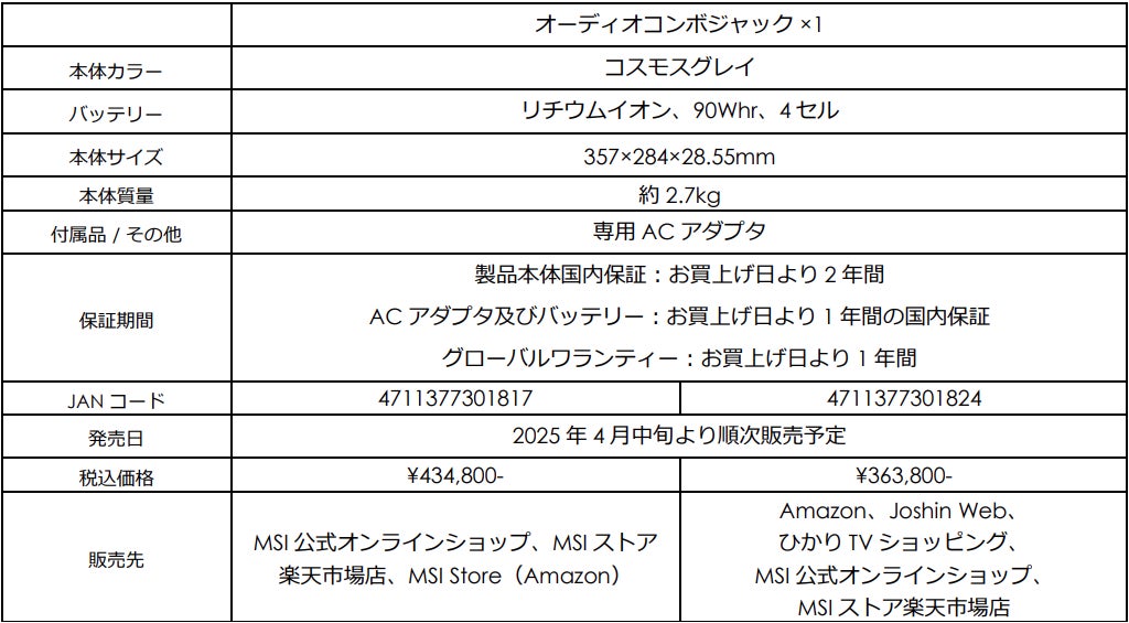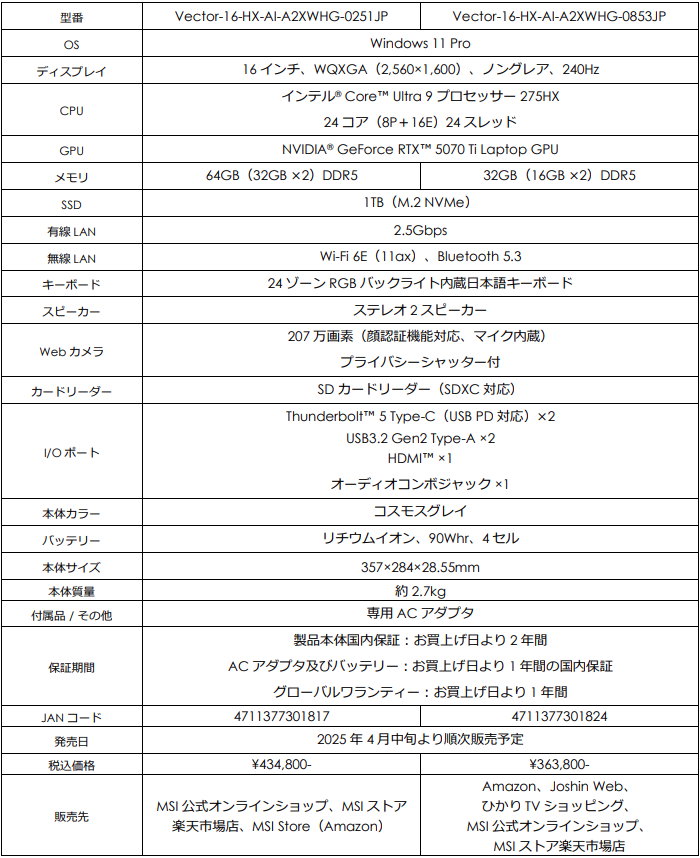 この度、エムエスアイコンピュータージャパン株式会社は、MSIゲーミングノートPC 2025年モデルに「GeForce RTX™ 5070 Ti Laptop GPU」搭載モデルをラインアップに加え、「Vector-16-HX-AI-A2XWHG-0251JP」「Vector-16-HX-AI-A2XWHG-0853JP」「Stealth-A16-AI+A3HWHG-6459JP」を2025年4月中旬より順次販売開始いたします。
