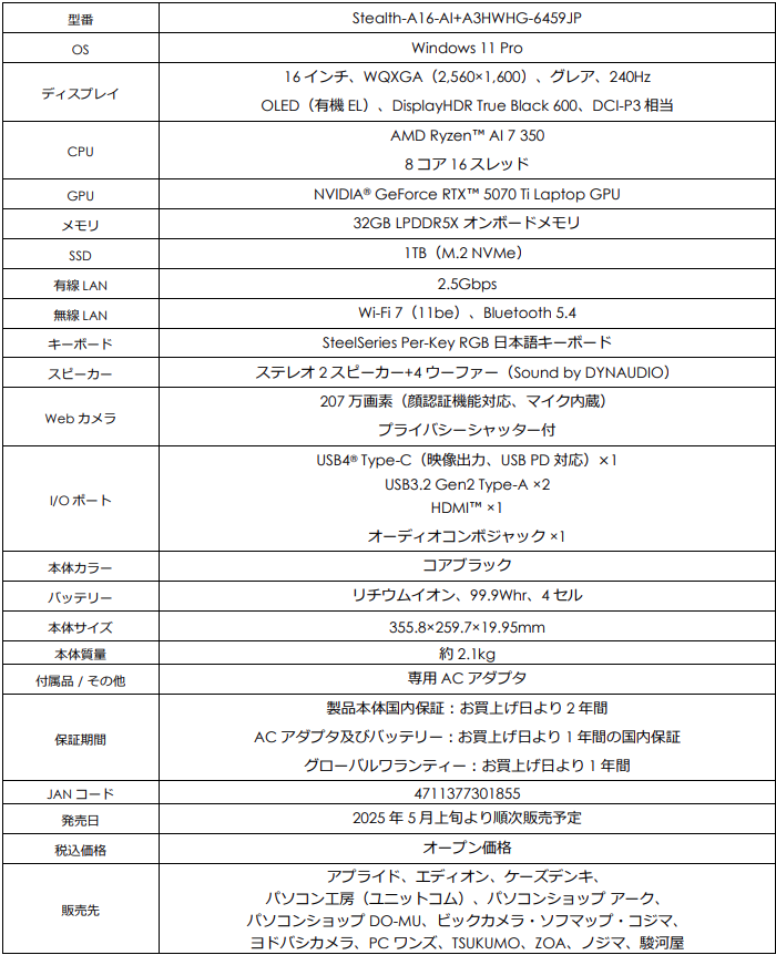 https://jp.msi.com/Laptop/Stealth-A16-AI-Plus-A3XWX