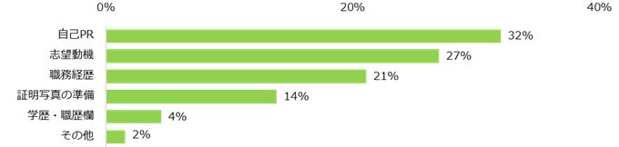 職務経歴書・履歴書の作成において最も苦手意識がある項目を聞くと、上位は「自己PR」(32%)、「志望動機」(27%)、「職務経歴」(21%)でした。