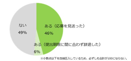 続けて、作成の負担が理由で”応募を見送ったことがあるか”を伺うと、46%が「ある(応募を見送った)」、6%が「ある(提出期限に間に合わず辞退した)」と回答しました。