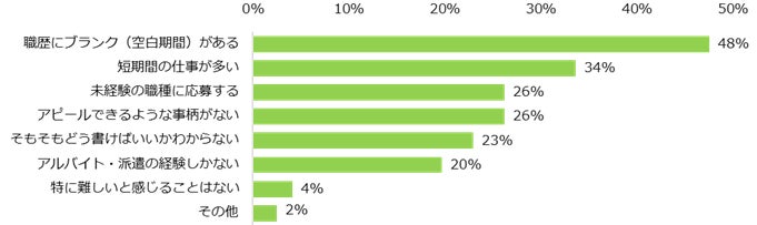 続けて、記入の難しさを感じる”状況”を伺うと、上位は「職歴にブランク(空白期間)がある」(48%)、「短期間の仕事が多い」(34%)、「未経験の職種に応募する」「アピールできるような事柄がない」(同率26%)でした。最後に、応募書類に関する悩み、失敗談・成功談も紹介します。