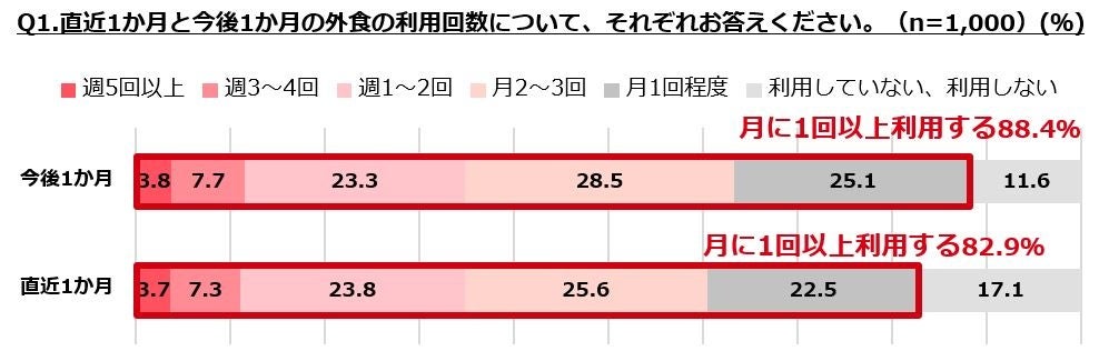 ・外食の利用回数は今後1ヶ月で月に1回以上利用すると回答した人が88.4%となり、直近1か月よりも5.5%上回る。