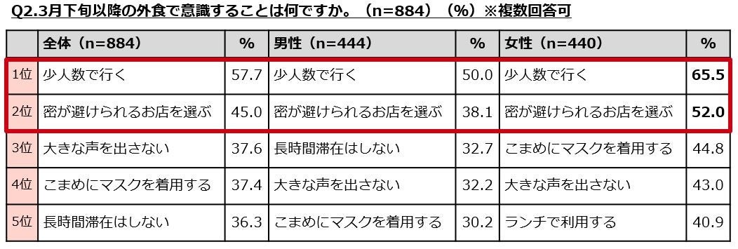 ・外食時の重視点は「少人数で行く」が最も多く、次いで「密が避けられる」が続く。上位項目のほとんどで女性の回答が男性を上回っており、女性の方が外食に対して慎重である傾向。