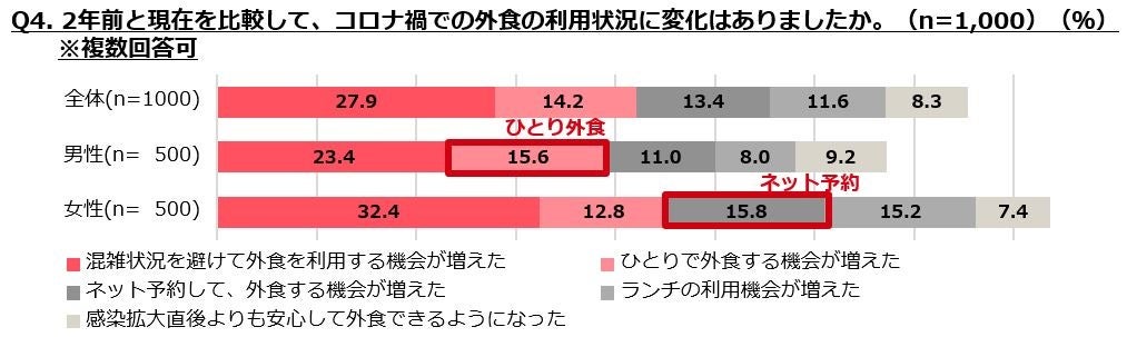 ・2年前との変化では「混雑を避けて利用する機会が増えた」が最も高く、男性は「ひとり外食」、女性は「ネット予約が増えた」が続く。