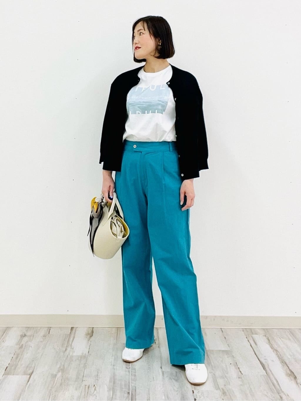 ブライトカラーをブラックで引き締めたカジュアルスタイル。リラクシーなTシャツとワイドパンツの組み合わせも、ブラックのカーディガンをプラスするだけでラフになりすぎず洗練された印象に仕上がります。インナーのTシャツは、自然の情景を切り取ったフォトプリントがポイント。全体のカラーコントラストを優しく和らげ、上品な着こなしに導きます。