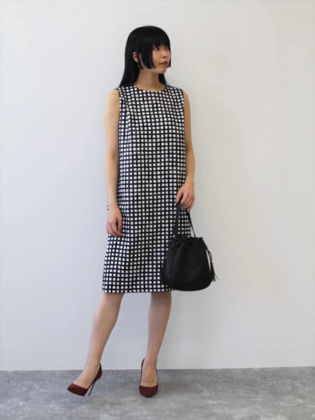 1枚で存在感のある、ギンガムチェック柄のワンピーススタイル。ブラックとホワイトのカラーコントラストが華やかでありながら、濃淡のある手描き風のタッチで優しい雰囲気も兼ね備えています。モノトーンのアイテムには、足元に差し色をプラスしてアレンジするのもおすすめです。