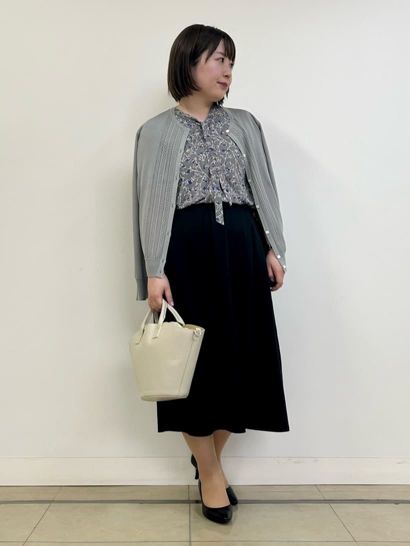 グレー×ブラックのモノトーンをメインにまとめた、オフィスシーンにもマッチするきれいめスタイル。甘い印象のフラワープリントも、控えめな配色を選べばシックに着こなせます。カットソーのプリントとカーディガンの編み柄が引き立つよう、ブラックのスカートを合わせて落ち着いた表情に。スカートは吸水速乾素材で、汗ばむ季節に嬉しい機能もポイントです。