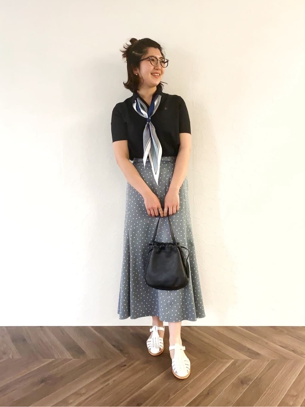 スポーティな印象のポロシャツを、女性らしい着こなしにアップデート。ホワイトやサックスを効かせることで、夏らしい清涼感をプラスしました。程よくボリュームのある襟元のスカーフは、目線が上がってスタイルアップ効果も。柄物を複数取り入れる時は、ブラックですっきり引き締めると上品にまとまります。