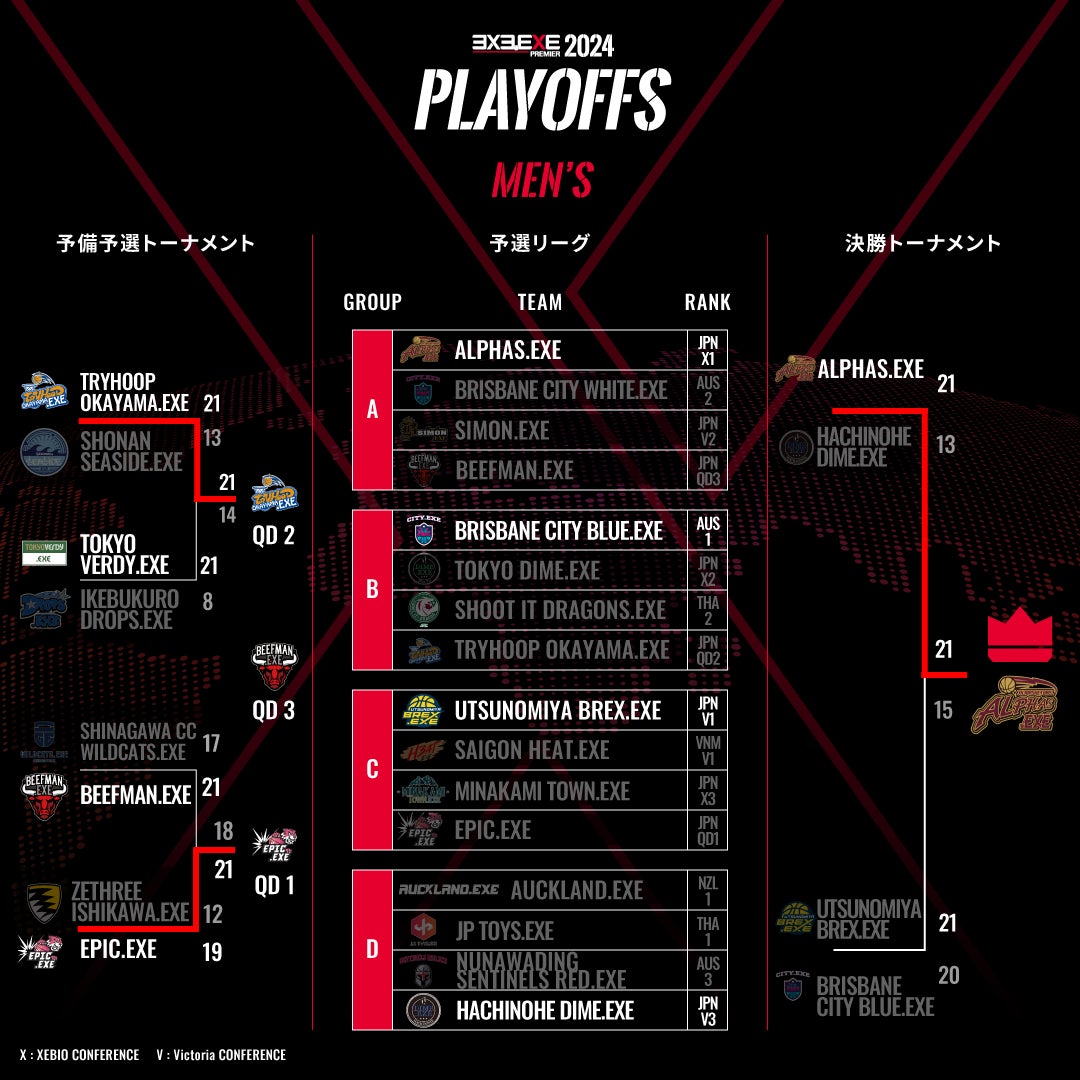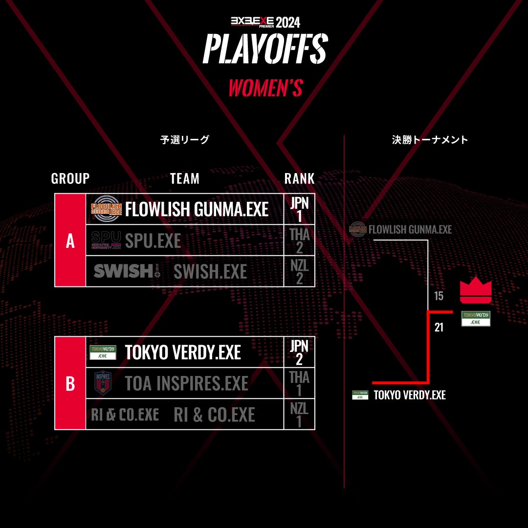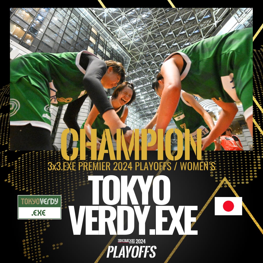 「3x3.EXE PREMIER 2024 PLAYOFFS」(スリーエックススリーエグゼ プレミアプレーオフ)優勝は、男子ALPHAS.EXE(2連覇)・女子TOKYO VERDY.EXE(初優勝)