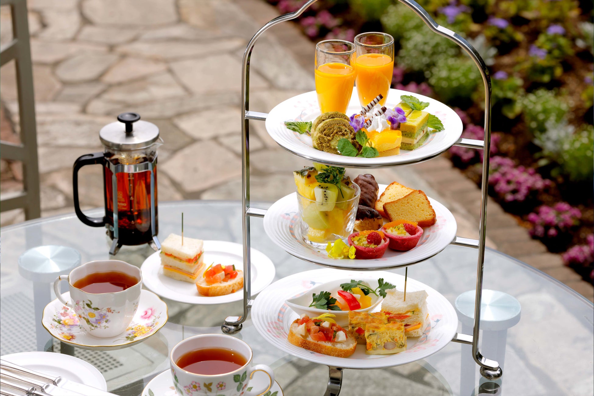 ピスタチオのガトーやマンゴープリン、フレッシュトマトとモッツアレラチーズのオープンサンドなどをはじめとするスイーツやセイボリーが盛り合わせたケーキスタンドとカメリアズティーハウスロンドンの紅茶を含むソフトドリンクをフリーフローでお愉しみください。