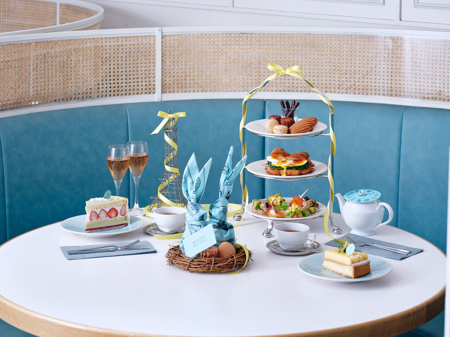 新作アフタヌーンティーセットでは、フランスで愛されるミモザを思わせるイエローや、清々しいパリの青空を表現した“RITUELブルー”をアクセントに、春の爽やかな気候を思わせる世界観を表現しました。