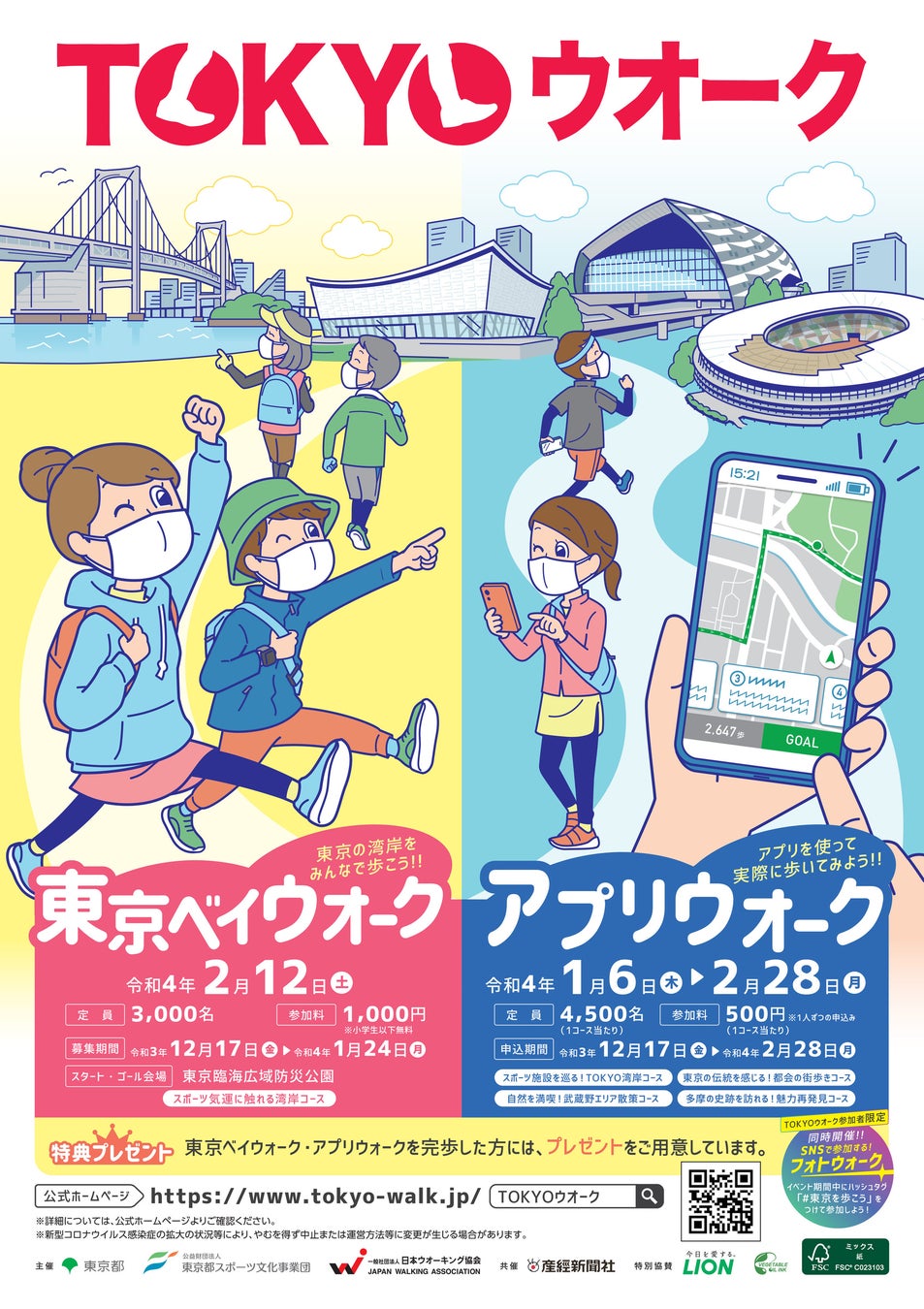 都民の健康づくりとスポーツへの興味、関心を喚起するため、都内の魅力あふれるエリアをめぐるウオーキングイベント「TOKYOウオーク」(東京都ほか主催、産経新聞社共催、ライオン特別協賛)が2022年1月6日(木)より開催。本日12月17日(金)から参加者を募集します。今回はスマートフォンアプリを使用した「アプリウォーク」に加え、特定日に特定会場へ集まって歩く「東京ベイウォーク」を開催します。