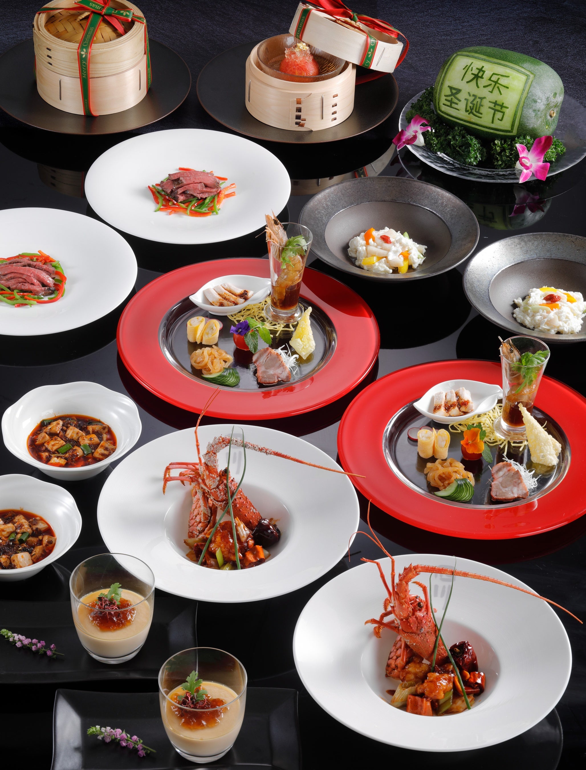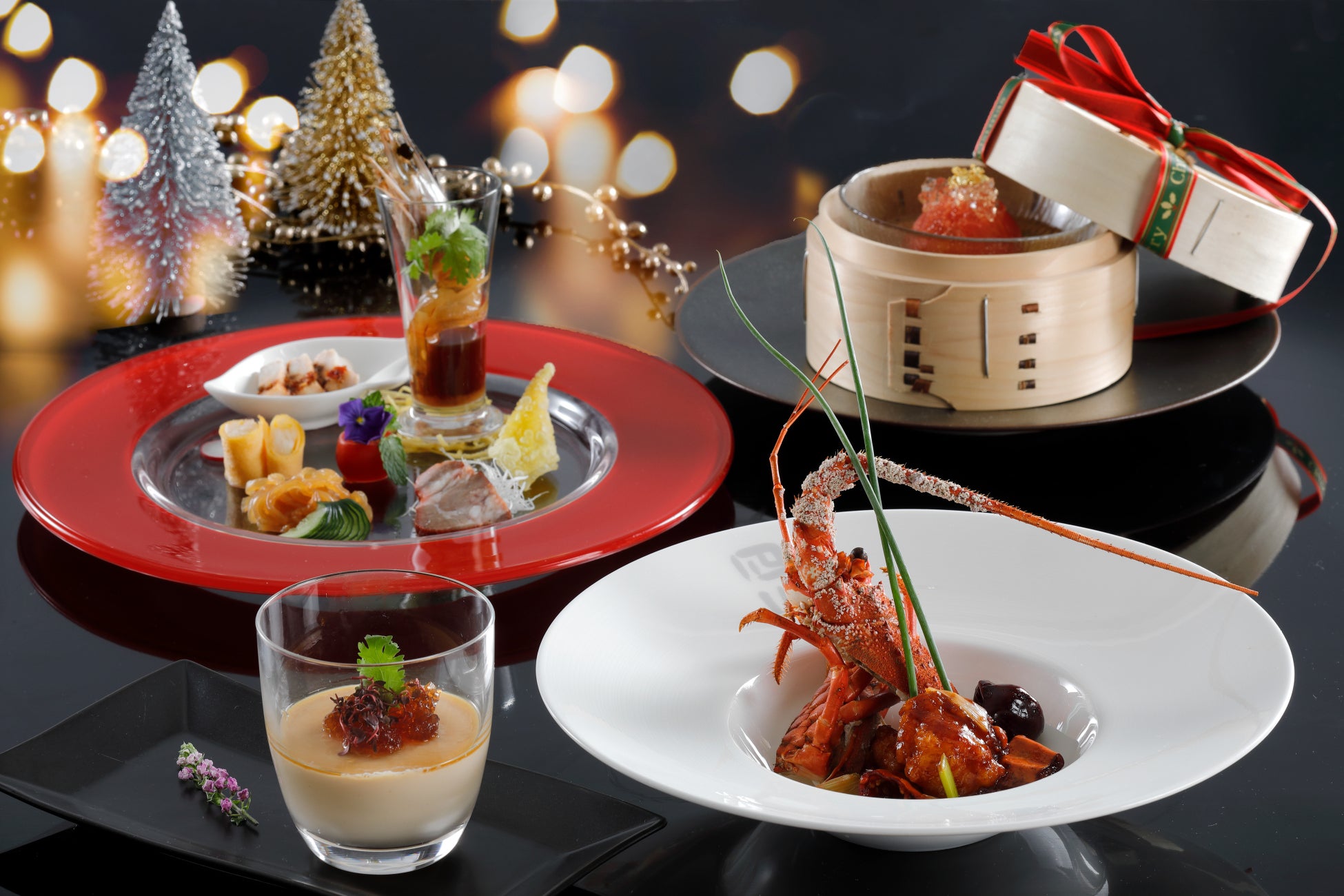 冷菜五種飾り盛り / 帆立貝柱と蟹肉の炒め物 卵白芙蓉仕立て / 国産牛もも肉のロースト チンジャオローススタイル / 伊勢海老の四川宮保唐辛子炒め / 海の幸入り中華風ロワイヤル コンソメジュレ添え / 陳麻婆豆腐 / 真っ赤なお鼻のサンタクロースからのデザート(トマトの杏子酒風味)