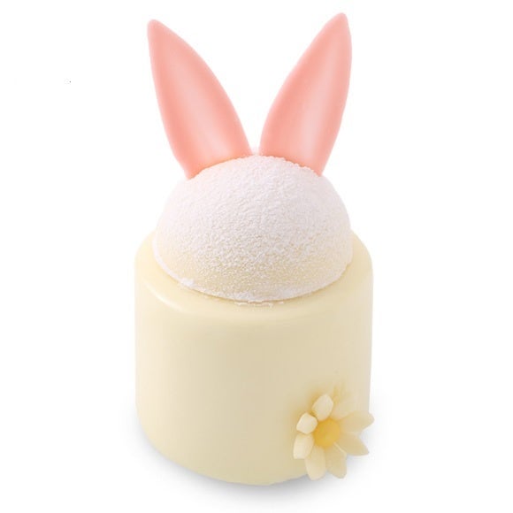 マスカルポーネムースで甘酸っぱい苺ムースを包みました。丸いフェイスはホワイトチョコレートムースです。春うさぎが幸せをお届けします。