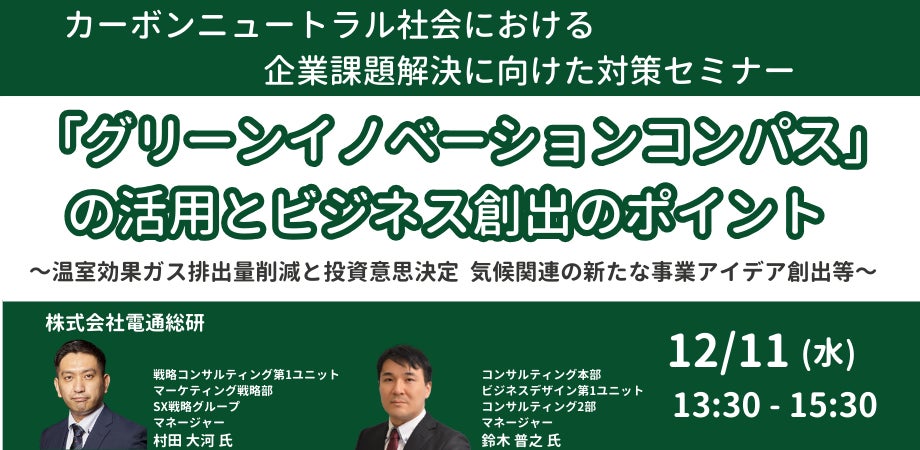 JPI(日本計画研究所)は、株式会社電通総研 戦略コンサルティング第1ユニット マネージャー 村田 大河 氏、コンサルティング本部 ビジネスデザイン第1ユニット マネージャー 鈴木 普之 氏を招聘し、「グリーンイノベーションコンパス」の活用とビジネス創出のポイントについて詳説いただくセミナーを開催します。