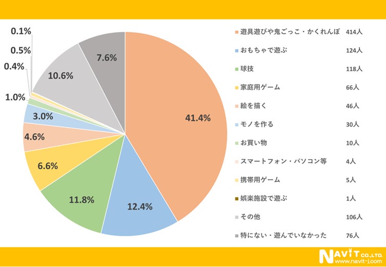 「遊具遊びや鬼ごっこ・かくれんぼ」という方が41.4%となっています。次に多かったのが「おもちゃで遊ぶ」で12.4%で「球技」が11.8%と続いています。