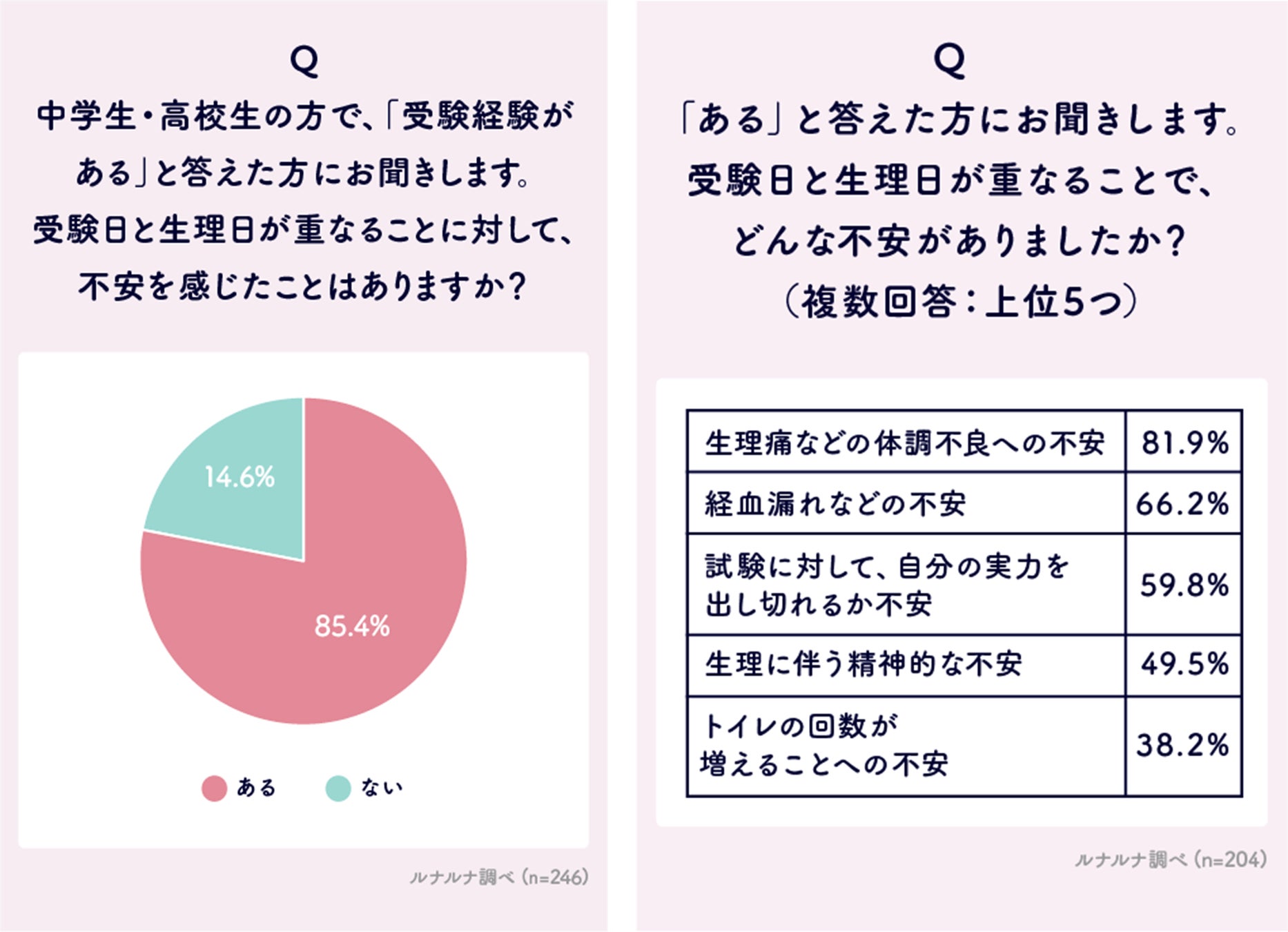 初めに、受験経験のある中高生を対象に、受験日と生理日が重なることに対して不安を感じたことがあるかを聞きました。「ある」と答えた人は85.4%、「ない」と答えた人は14.6%という結果となりました。