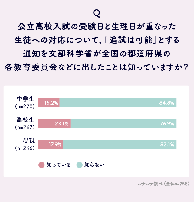 Q.公立高校入試の受験日と生理日が重なった生徒への対応について、「追試は可能」とする通知を文部科学省が全国の都道府県の各教育委員会などに出したことは知っていますか?