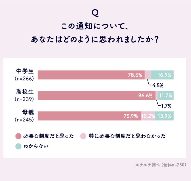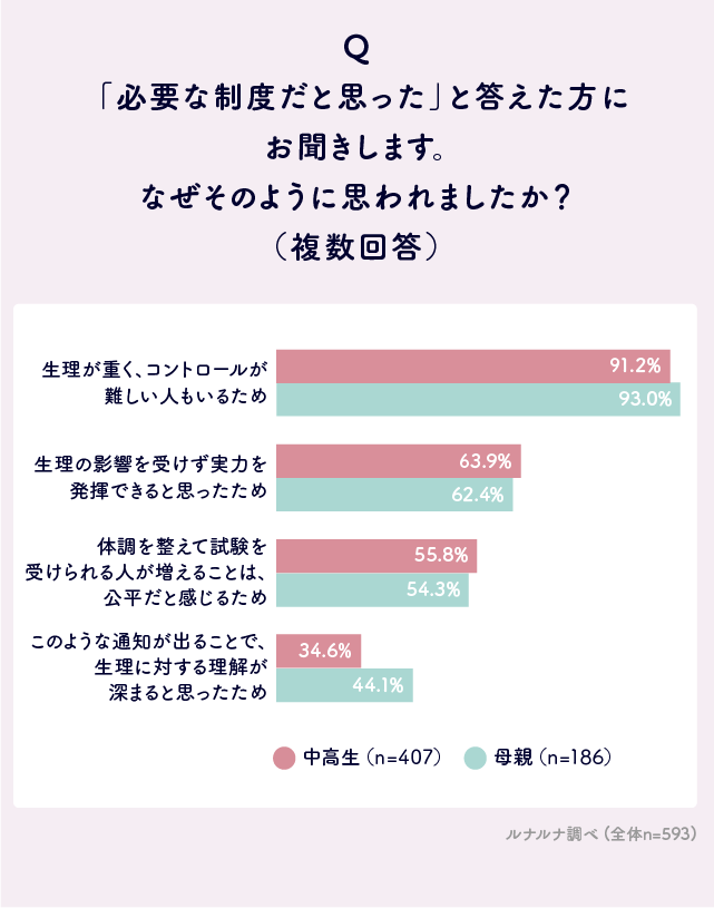 必要な制度だと思った理由は、回答が多かった順に「生理が重く、コントロールが難しい人もいるため」は中高生91.2%、母親93.0%、「生理の影響を受けず実力を発揮できると思ったため」は中高生63.9%、母親62.4%、「体調を整えて試験を受けられる人が増えることは、公平だと感じるため」は中高生55.8%、母親54.3%となりました。「このような通知が出ることで、生理に対する理解が深まると思ったため」と回答した人は、中高生で34.6%、母親で44.1%おり、こういった制度の拡大によって、生理に対する理解度の向上を期待している人が一定数いることがわかります。また、親世代は周囲の理解を促したいと考える人が子どもの世代よりも多いようです。