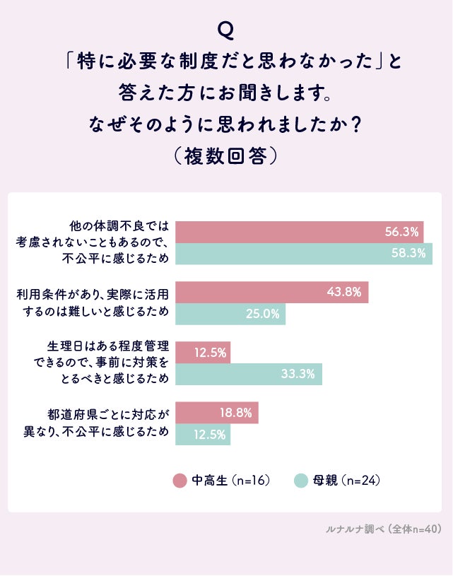 一方で、少数ですが「特に必要な制度だと思わなかった」と回答した人もいました。その理由として、「他の体調不良では考慮されないこともあるので、不公平に感じるため」は中高生56.3%、母親58.3%、「利用条件があり、実際に活用するのは難しいと感じるため」は中高生43.8%、母親25.0%、「生理日はある程度管理できるので、事前に対策をとるべきと感じるため」は中高生12.5%、母親33.3%という結果となりました。