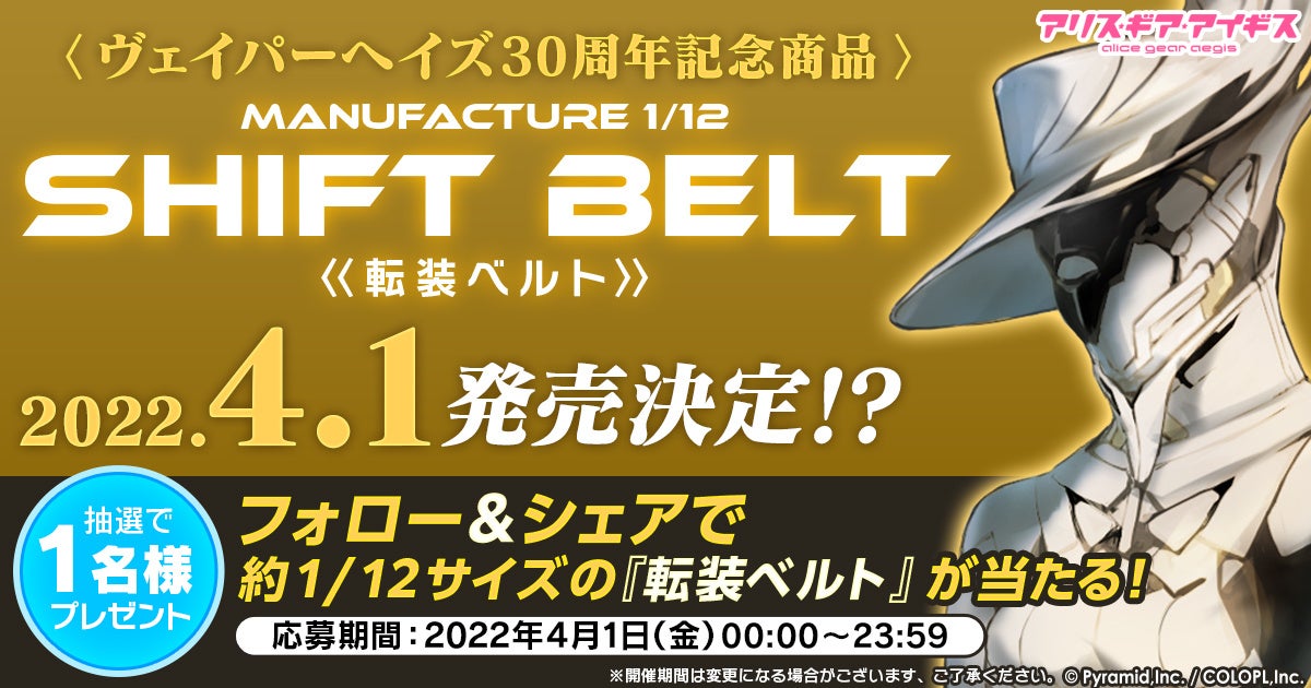 株式会社コロプラ(代表取締役社長:宮本貴志、本社:東京都渋谷区、以下「コロプラ」)は、スマートフォン向けゲーム『アリス・ギア・アイギス(以下、アリスギア)』にて、本日2022年4月1日(金)に、ヴェイパーシリーズ30周年記念商品「MANUFACTURE 約1/12サイズ 転装<シフト>ベルト」の発売を決定したことをお知らせいたします。