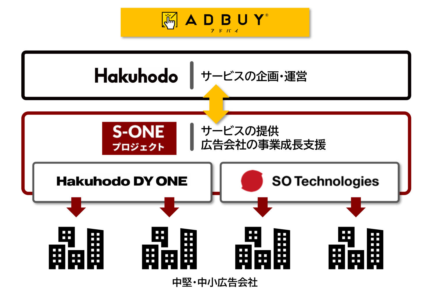 こうした課題を解決すべく、博報堂、Hakuhodo DY ONE、SOTの3社は、博報堂DYグループ外の広告会社を対象に、グループ内で活用されてきた「ADBUY」の外部提供を開始します。博報堂が「ADBUY」の運営を担当し、Hakuhodo DY ONEとSOTが共同で推進する中堅・中小規模の広告会社の事業成長を支援する取り組み「S-ONEプロジェクト※」を通じて広告会社へのセールスを行います。