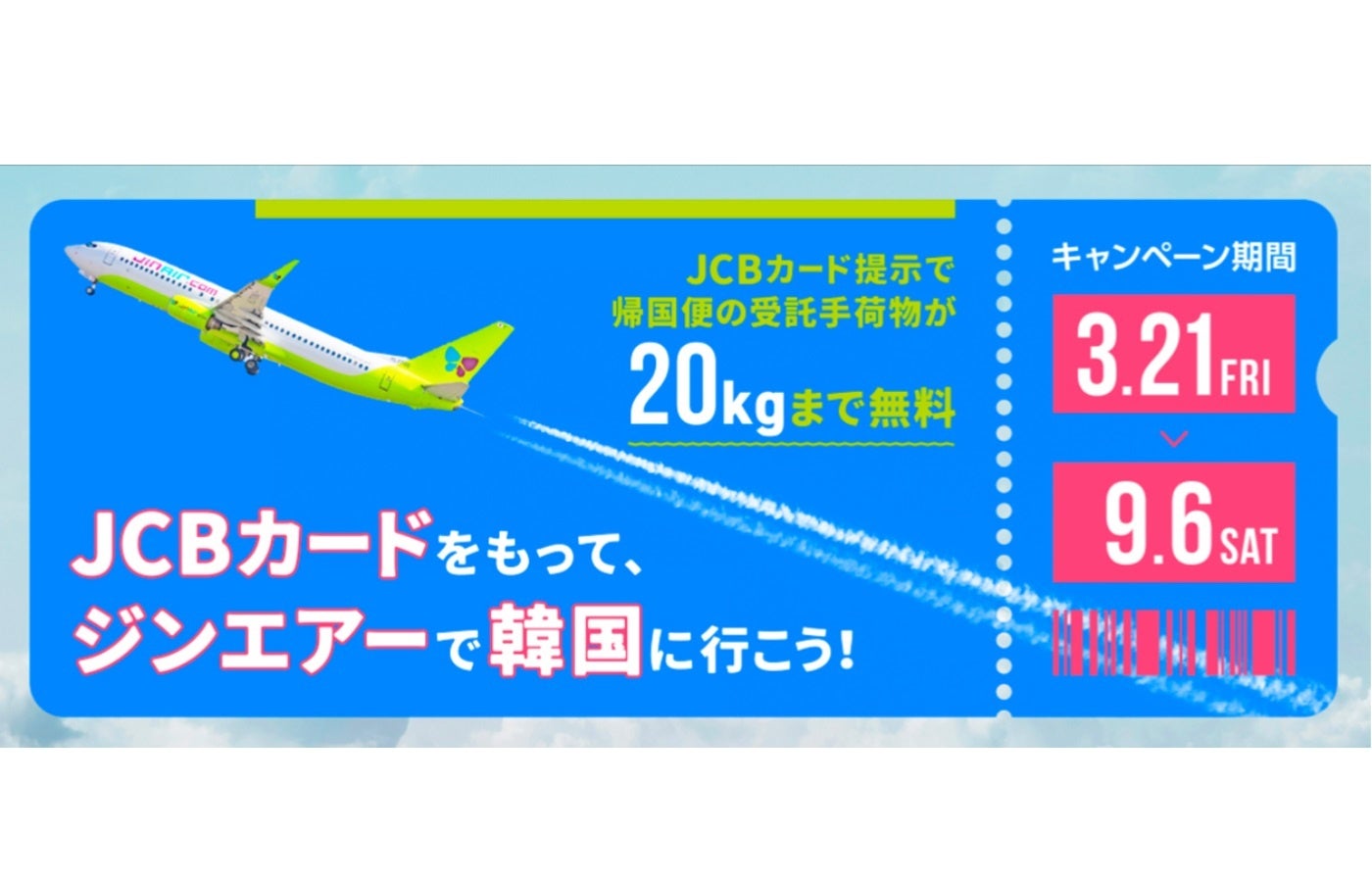 株式会社ジェーシービー(本社:東京都港区、代表取締役兼執行役員社長:二重 孝好、以下:JCB)は、株式会社ジンエアー(本社:韓国、代表:Byungryool Park、以下:ジンエアー)と、2025年3月21日(金)から9月6日(土)まで、ジンエアーの日本と韓国を結ぶ直行便の往復航空券を購入された方を対象として、日本および韓国の空港チェックイン時にJCBカードを提示すると、もれなく帰国便利用時(出発便除く)の受託手荷物が20kgまで無料になるキャンペーンを実施します。また、ジンエアー公式サイトではJCBカード会員様限定に日本発韓国行き往復航空券の割引や抽選で景品が当たるキャンペーンも実施いたします。