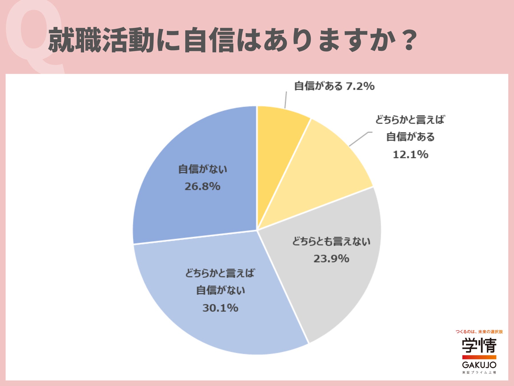 就職活動について、「自信がある」と回答した学生は7.2%でした。「どちらかと言えば自信がある」12.1%を合わせても、就職活動に自信を持っている学生は2割に満たないことが分かります。「自信がない」「どちらかと言えば自信がない」の回答が6割に迫りました。