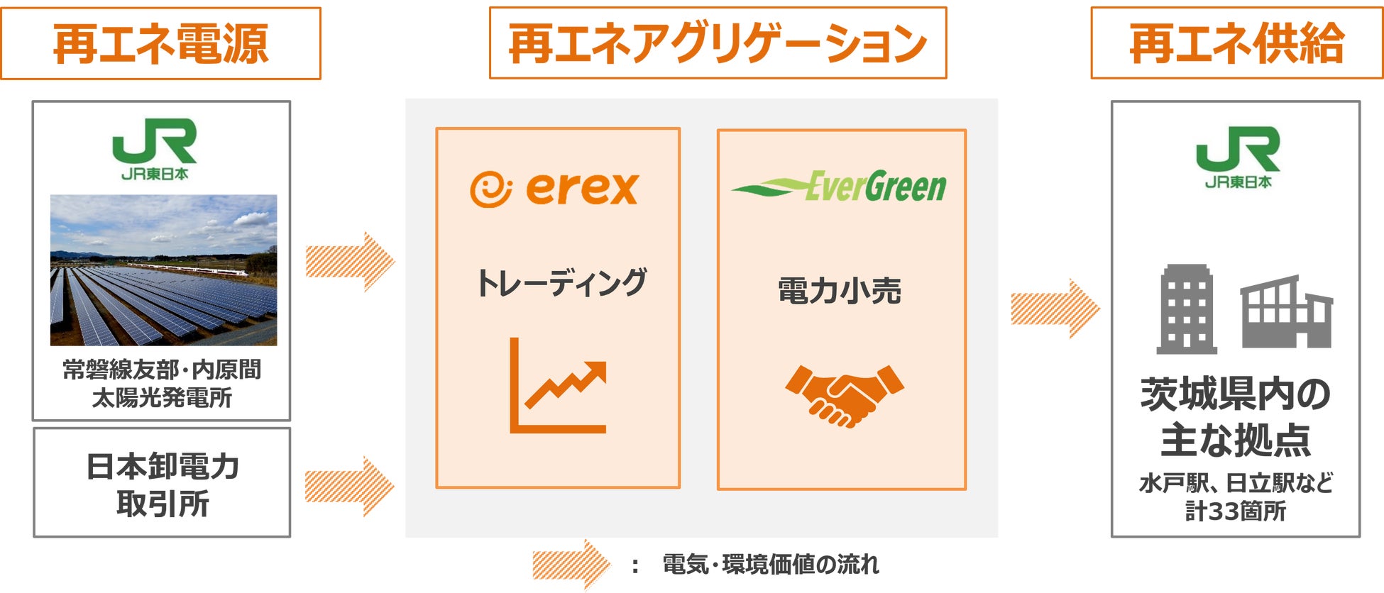 ・JR東日本が保有する内原太陽光発電所の適用制度をFITからFIPへ切り替え、イーレックスに電力と環境価値を供給します。イーレックスはJR東日本に代わって電力の需給調整を行い、イーレックスグループの販売子会社であるエバーグリーン・マーケティング株式会社を通じて、内原太陽光発電所により生み出された環境価値を安定的にJR東日本に供給します。