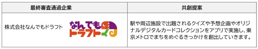 2023年9月から「Tokyo Metro ACCELERATOR 2023」において「新規事業創出プログラム」に関わる協業パートナー企業の募集を行いました。 今回ご応募いただいた149件の中から唯一最終審査を通過した、株式会社なんでもドラフトと今後共創に取り組みます。