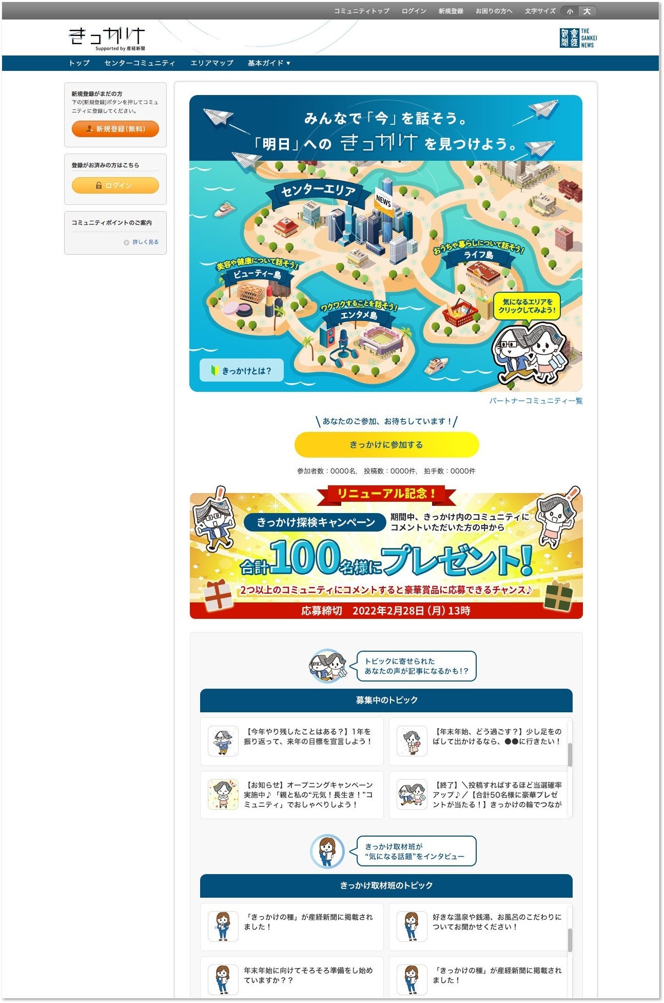 2021年12月21日、産経新聞社(東京都千代田区/代表取締役社長:飯塚 浩彦)と、ファンコミュニティ構築・運営大手のクオン(東京都港区/代表取締役:武田 隆)が共同で運営する「きっかけ」( https://www.beach.jp/community/KIKKAKE/ )は、コミュニティデザインを一新し、リニューアルいたしました。