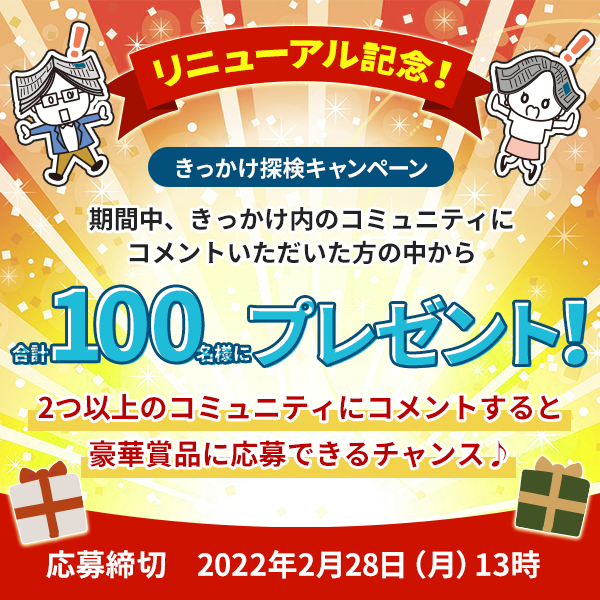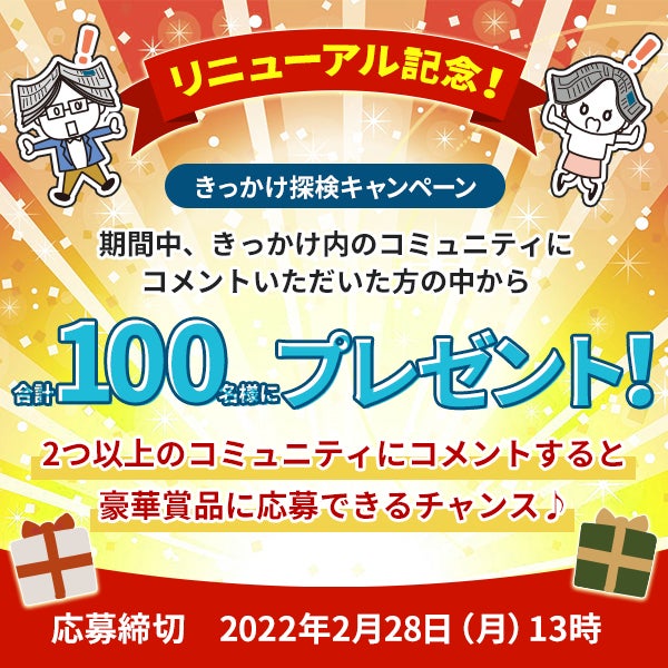 リニューアルを記念して、「きっかけ」およびパートナーコミュニティにご登録いただき、投稿を行うなど、条件を満たした方を対象に「グランビスタ ホテル&リゾート利用券」や「Amazonギフト券」が計100名様に当たるキャンペーンを実施します。締め切りは2022年2月28日(月)13時です。