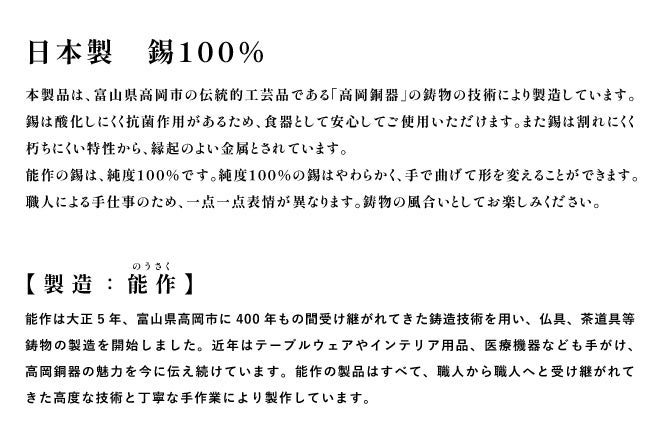 | 【平皿 商品の詳細】 三日月宗近 錫製の平皿 NSK-002MM ¥19,800(税込) 鶴丸国永 錫製の平皿 NSK-004TK ¥19,800(税込) ■素材:錫100%(一部金箔の加工あり) 本製品は、富山県高岡市の伝統的工芸品である「高岡銅器」の鋳物の技術により製造しています。錫は酸化しにくく抗菌作用があるため、食器として安心してご使用いただけます。また錫は割れにくく朽ちにくい特性から、縁起のよい金属とされています。 能作の錫は、純度100%です。純度100%の錫はやわらかく、手で曲げて形を変えることができます。 職人による手仕事のため、一点一点表情が異なり、鋳物の風合いとして楽しめます。 ■使用上の注意 ・融点が低いため、火気の近くに置かないでください。 ・金属磨きやスチールたわし等でこすらないでください。 ・電子レンジ、食器洗浄機、乾燥機はご使用になれません。 ■メンテナンスに関して ・ ご使用後は、やわらかいスポンジを用いて、台所用中性洗剤で洗ってください。洗った後は、乾いた布でよく拭き取ってください。 ・ 光沢が鈍くなってきた際は、重曹を台所用中性洗剤や水で溶き、ペースト状にしたもので磨いてください。 ※金箔製品は金属磨きや重曹を使用しないでください。 ・やわらかい素材のため、形を変化させることができますが、過度な屈伸は亀裂や破損の原因となるためご注意ください。 ・形を変えるときに音がしますが、破損音ではありません。 |