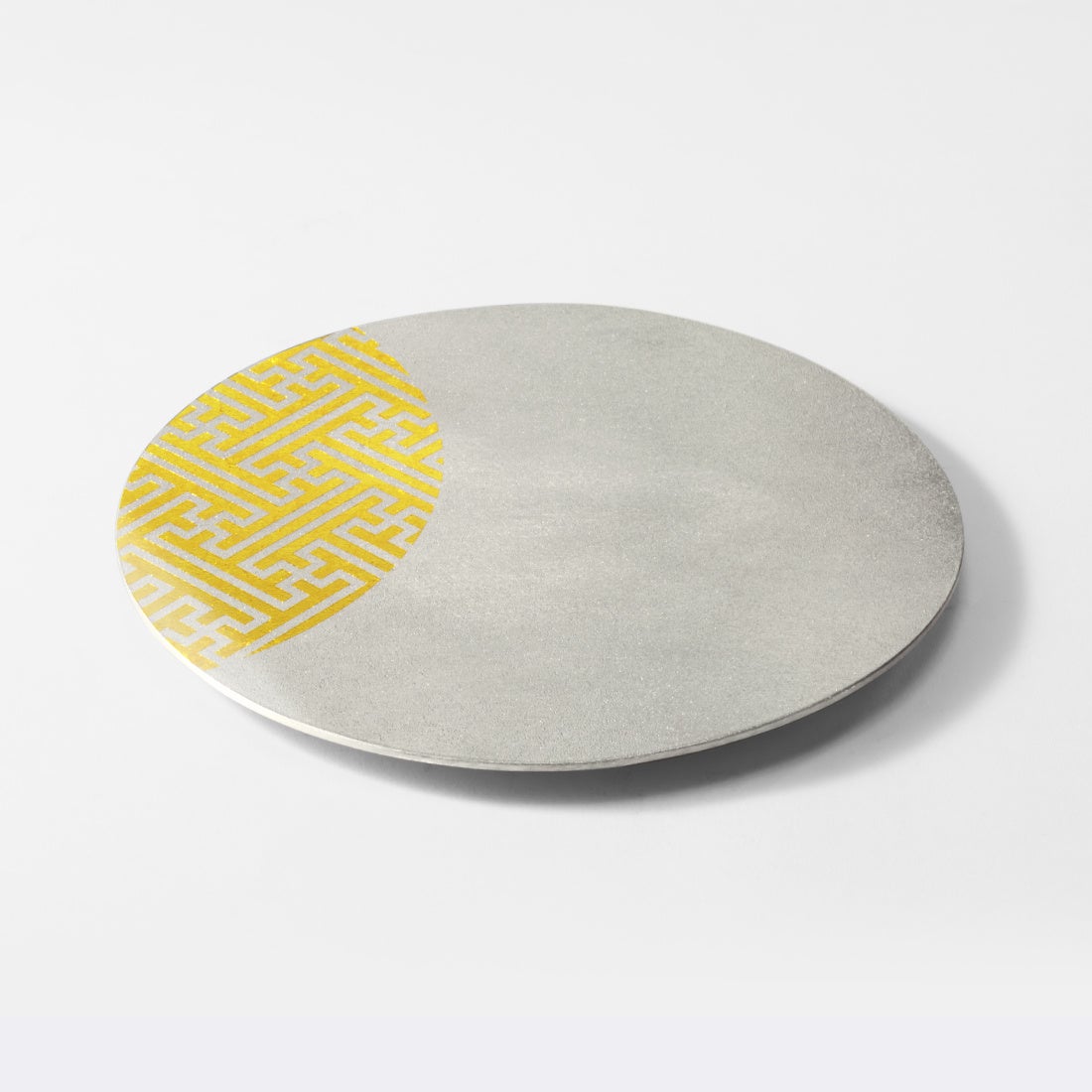 三日月宗近をイメージした錫製の平皿。ゴールドの模様部分には日本の伝統工芸である金箔を使用し、三日月宗近の着物の柄を表現しています。日本製の錫を100%使用しており、錫特有の質感と金箔のコントラストが上品です。伝統工芸の技術を駆使しながら、モダンなデザインで現代のライフスタイルに溶け込みやすいデザインです。