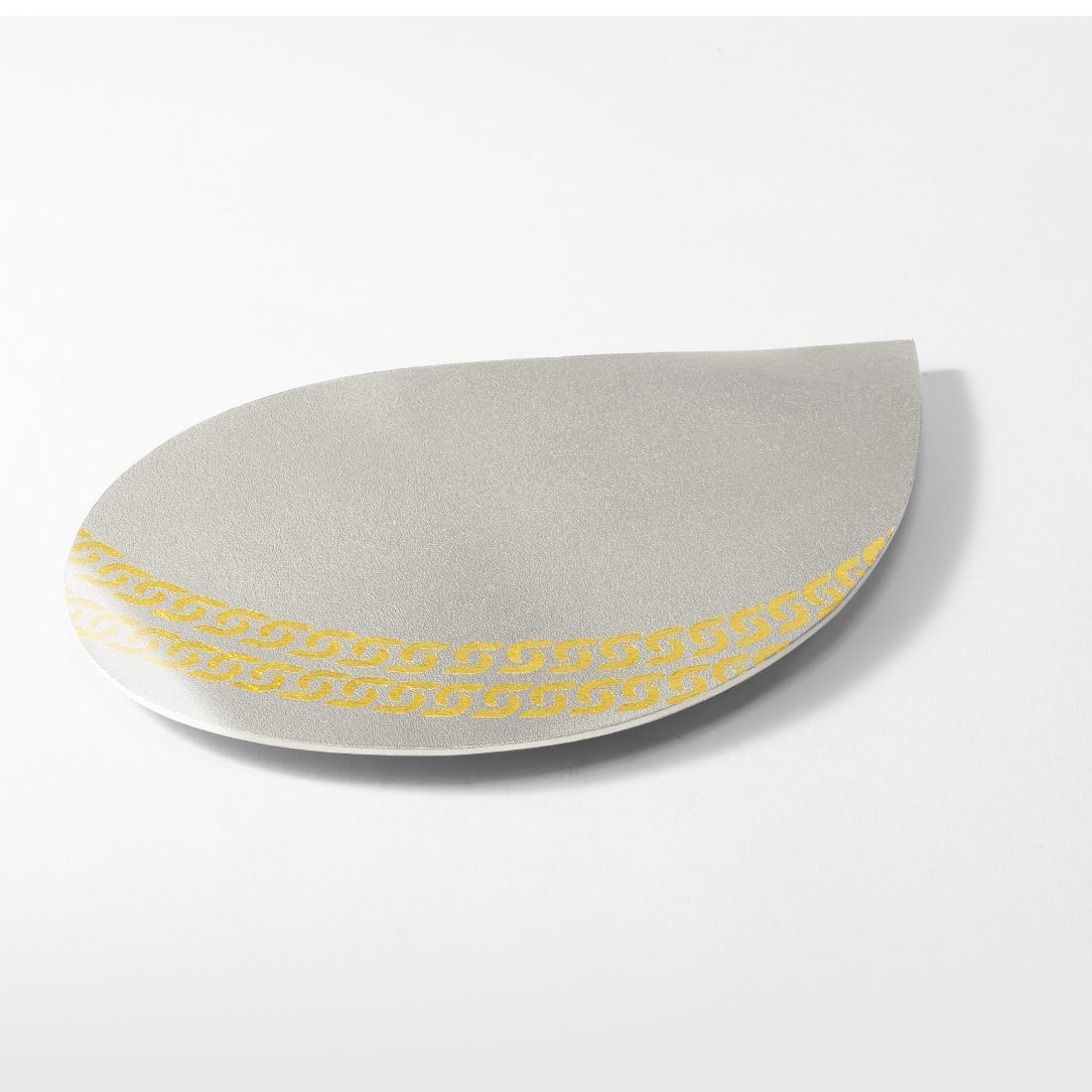 鶴丸国永をイメージした錫製の平皿。形は羽をイメージしており、金箔の模様部分は鶴丸国永の着用している服の装飾をイメージしたデザインです。緩やかに湾曲した柄と、羽の形状が落ち着きのあるデザインです。伝統工芸の技術を駆使しながら、モダンなデザインで現代のライフスタイルに溶け込みやすいデザインです。