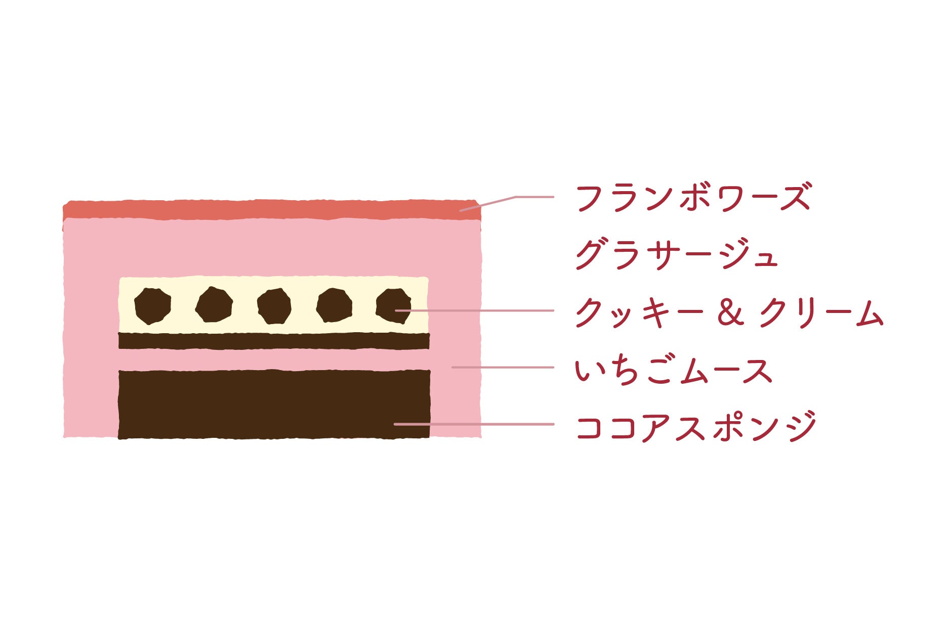 に、しっとり食感のココアスポンジとクッキー&クリームを忍ばせました。仕上げにはフラ