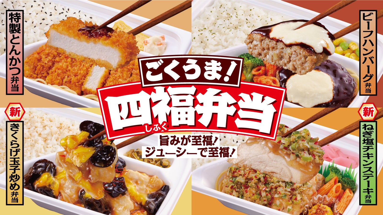 「ごくうま!四福弁当」は、既存商品「特製とんかつ弁当」のパワーアップはもちろん、お客様の節約志向を考慮した500円台の商品「ビーフハンバーグ弁当」・「ねぎ塩チキンステーキ弁当」・「きくらげ玉子炒め弁当」も登場します。至福な気分になれるおいしさと、満足できるボリューム感、これぞ“至福のクオリティ”「ごくうま!四福弁当」を、ぜひお召し上がりください。