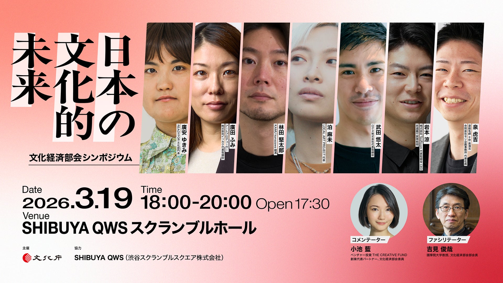 本シンポジウムでは、文化経済部会の議論をけん引している部会長の吉見俊哉氏(國學院大學教授)をファシリテーターに、委員の小池藍氏(ベンチャー投資THE CREATIVE FUND創業代表パートナー)をコメンテーターとしてお呼びするとともに、泉虎吉氏(漆刷毛師 十世 泉清吉/合同会社セン企画事務所 代表社員)、岩本涼氏(株式会社TeaRoom 代表取締役CEO・茶道裏千家準教授)、武田悠太氏(ログズ株式会社代表取締役)、泊麻未氏(LOCAL ART PROJECT代表)、林田堅太郎氏(KAMU kanazawa館長)、廣田ふみ氏(アートプロデューサー/株式会社イッカク代表取締役)、廣安ゆきみ氏(READYFOR文化部門長)の7名の全国各地で活躍する次代を担うプロデューサー等の方々をお招きします。